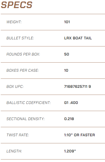 .257” 25 CAL 101gr LRX: Designed around the 257 WBY Mag, this bullet extends the range by increasing downrange velocity due to its high BC and reduces wind drift. Other applications are 257 Roberts & 25-06 Rem.