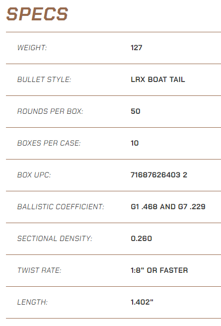 Barnes Long Range X, arguably the most premier monometal hunting bullet made to date. All copper contruction retains 100% of it's weight, ensuring deep penetration through thick muscle and heavy bone. Sleek shape reduces air friction and improves downrange impact velocity and energy, minimizing wind deflection. A terrific choice in any caliber, for any game hunted - Barnes LRX
