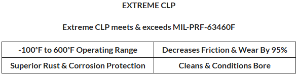 Extreme CLP’s technologically advanced formulation incorporates proprietary additives that penetrate deep into the metal’s pores and bond to the surface creating an enhanced film strength layer that provides superior anti-wear properties over a wide range of operating temperatures. Extreme CLP will not burn off under the extreme temperatures found during full auto fire or become sticky and gummy in the extreme cold temperatures with a -100˚F to 600˚F operating range.