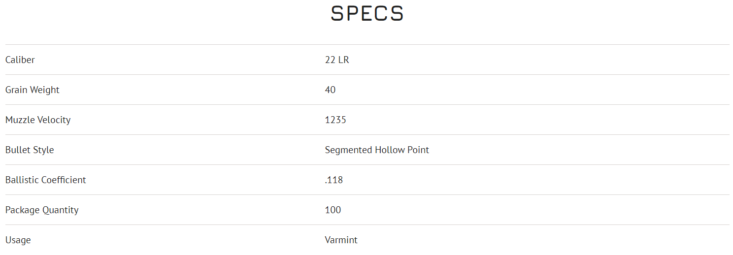 Mini-Mag® remains one of our most popular 22 Long Rifle loads, offering unbeatable accuracy, high velocities, flat trajectories and superior reliability. Mini-Mag Segmented Hollow Point combines all of what made the original a favorite with a bullet engineered to split into three equal-size parts on impact, creating three distinct wound channels that quickly take down small game and varmints. The ammunition also features CCI’s extremely reliable priming and specialized powders for clean, consistent ignition.