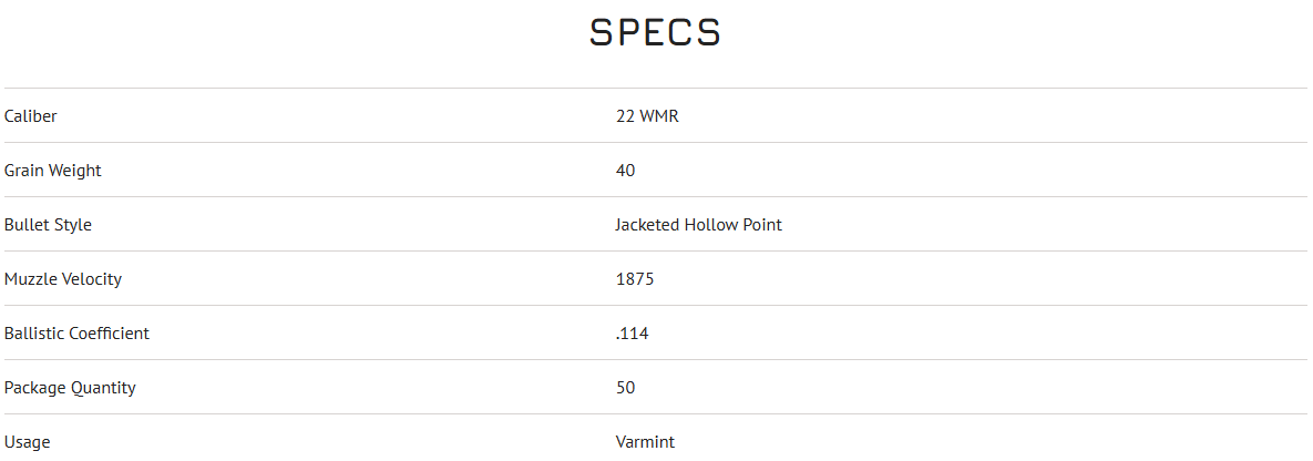 Harness the power of one of the fastest 22 WMR cartridges on the market. These loads' jacketed hollow-point bullet design transfers tremendous energy to the target on impact, and clean-burning propellants and CCI® priming ensure the most consistent ballistics.