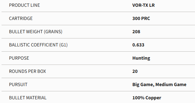 This ammunition is loaded with premium all-copper Barnes LRX bullets specially designed not only for precision at long range but unrivaled on-game effectiveness at every range.