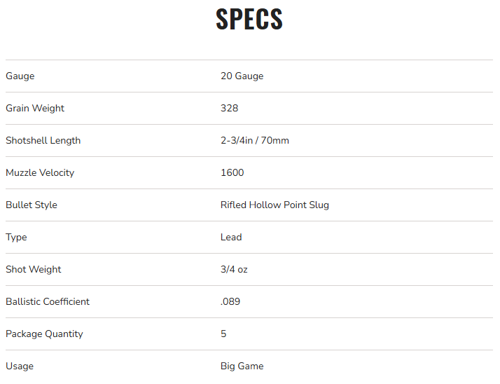 Federal Power-Shok Rifled Slug, 20ga, 3/4oz, 2-3/4 in, 1600 fps