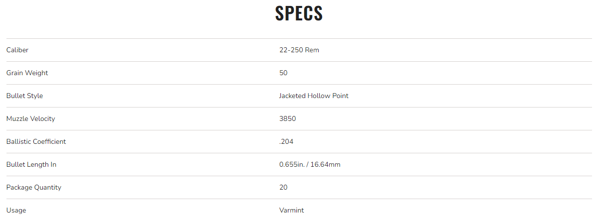Federal Varmint & Predator, 22-250 Rem, 50gr, Jacketed Hollow Point, 3850 fps