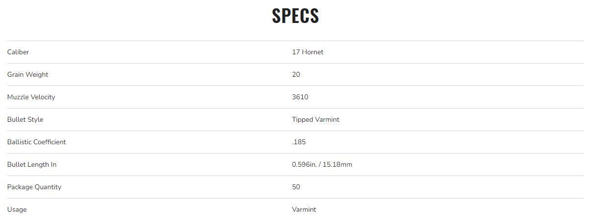 Federal Varmint & Predator, 17 Hornet, 20gr, Tipped Varmint, 3610 fps