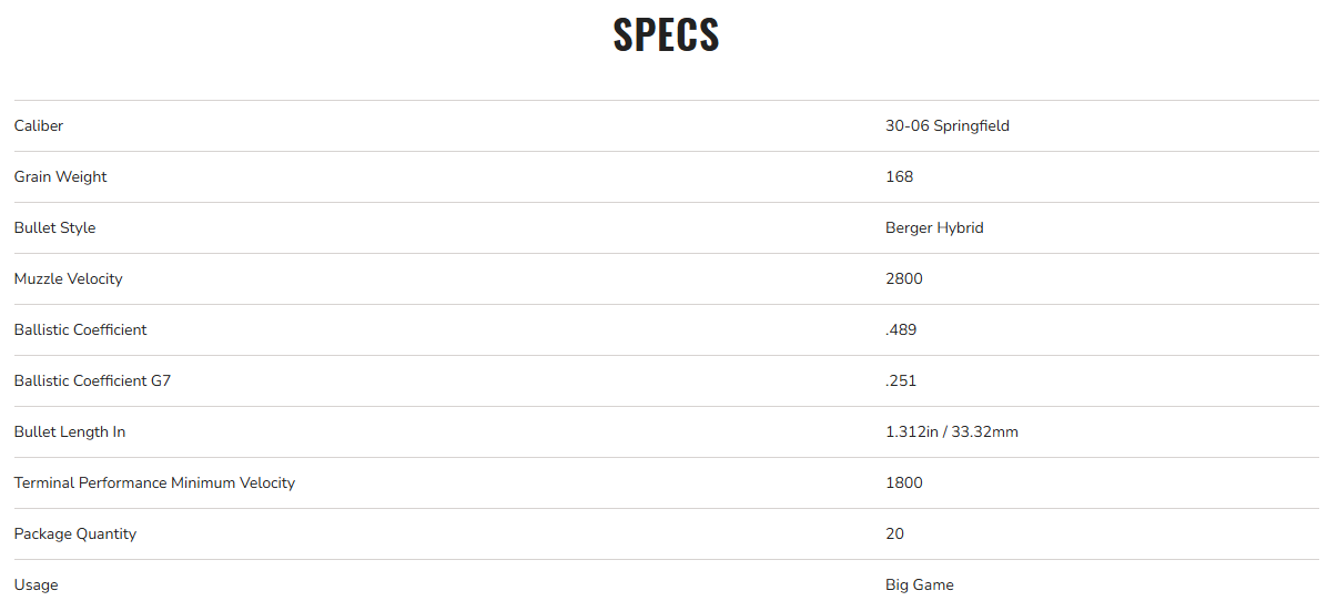 Federal Premium 30-06 Springfield, 168gr, Berger Hybrid Hunter, 2800 fps