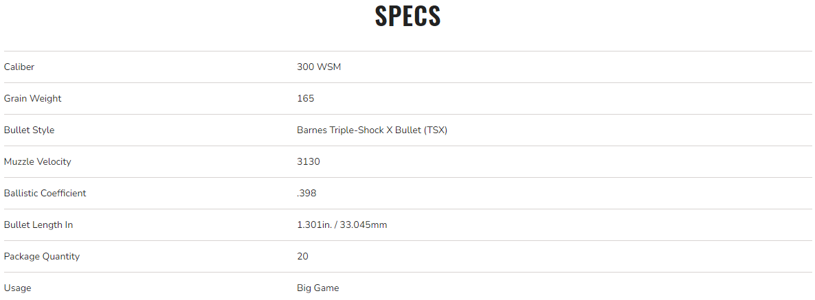 Federal Premium 300 WSM, 165gr, Barnes Triple-Shock, 3130 fps**