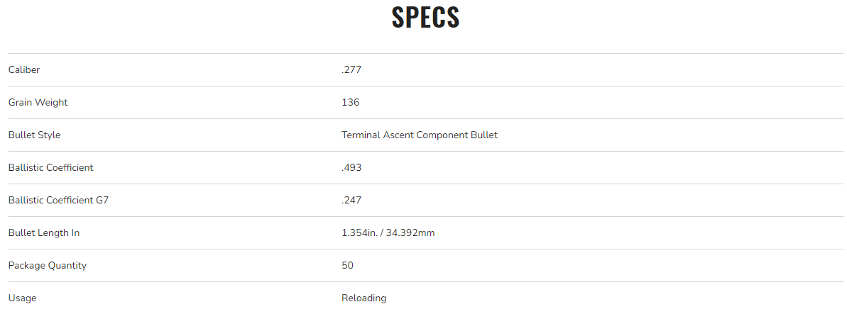 Any hunt. Any range. Go beyond what you ever thought possible with Federal Premium® Terminal Ascent™. Bonded construction penetrates deep on close targets, while the patented Slipstream™ polymer tip initiates expansion at velocities 200 fps lower than comparable designs. The bullet's long, sleek profile offers an extremely high ballistic coefficient, and its AccuChannel™ groove technology improves accuracy and minimizes drag. Available in a full selection of long-range hunting cartridges.