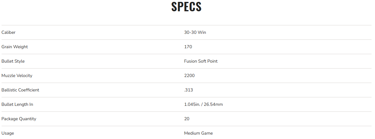 Fusion 30-30 Win, 170gr, Soft Point, 2200 fps