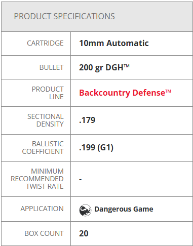 For those backcountry encounters when a reliable round can be a lifesaver, Hornady introduces Backcountry Defense™ ammunition. Featuring the DGH™ (Dangerous Game Handgun) bullet, providing maximum penetration and no deflection, Backcountry Defense™ delivers peace of mind from your favorite backcountry sidearm. Available in popular cartridges from 9mm up to 500 S&W.