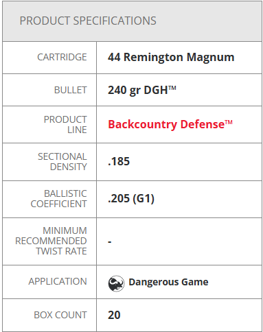 For those backcountry encounters when a reliable round can be a lifesaver, Hornady introduces Backcountry Defense™ ammunition. Featuring the DGH™ (Dangerous Game Handgun) bullet, providing maximum penetration and no deflection, Backcountry Defense™ delivers peace of mind from your favorite backcountry sidearm. Available in popular cartridges from 9mm up to 500 S&W.
