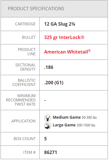 Designed for fully rifled barrels, Hornady® American Whitetail® Slugs are loaded with 325-grain Hornady® InterLock® bullets. A hollow point serrated design initiates rapid expansion upon impact, and a tough, lead alloy core is lethal out to 200+ yards. The rigid polycarbonate sabot ensures accuracy. The end result is an accurate delivery system for a tough shotgun slug capable of taking the biggest midwestern whitetails.