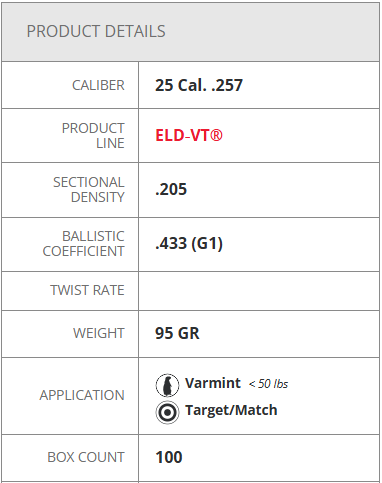 Born from a culmination of years of ballistic research, the ELD-VT™ pairs the aerodynamics of low drag match bullets with the lighter weight of a varmint bullet, giving the ELD-VT™ a level of uncompromising dual-purpose performance. Say goodbye to compromise, as this bullet’s match-winning accuracy and rapid expansion will set new standards.