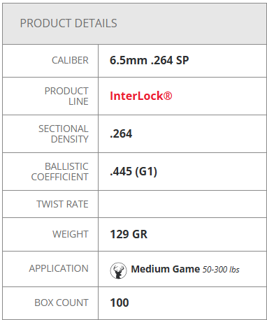 The raised InterLock® ring is embedded in the bullet's core, ensuring the core and jacket are locked in one piece during expansion to retain mass and energy.