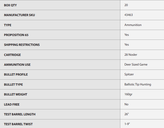 Loaded with a 160gr Spitzer Ballistic Tip® Hunting Bullet and Nosler® Premium Brass