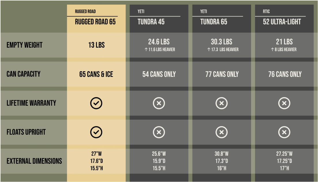 Weighing 50% less than leading coolers, the Rugged Road 65 V2 offers easy portability while maintaining ample storage capacity.