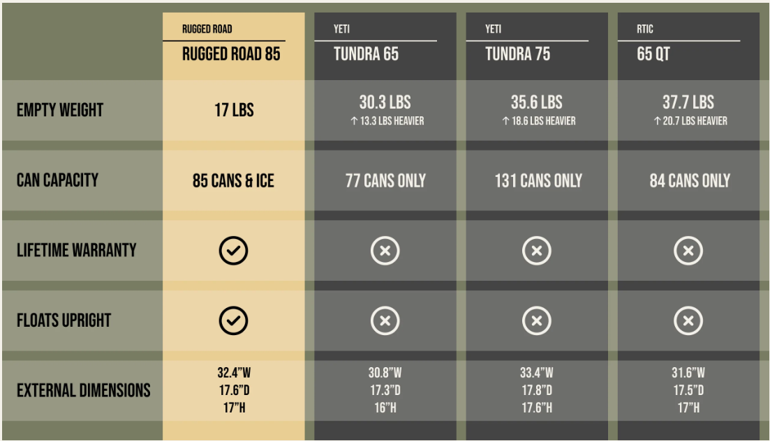 Rugged Road coolers are more than just lightweight and durable – they're a revolution in outdoor gear technology. Our coolers are easy to carry, float upright, and are reliable in all outdoor conditions. Explore further with thoughtfully designed features and a patented manufacturing process that enhance every adventure.
