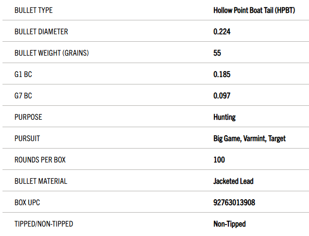 For rifles, the 55 grain #1390 Hollow Point Boat Tail bullet has been designed for the shooter who prefers the rapid expansion characteristics of the hollow point design. This bullet delivers devastating expansion on varmints and small game, and in many rifles it routinely delivers match-grade accuracy, which are vital considerations for long-range varmint shooting. The large, open point makes this a very dependable bullet for all 22 centerfire cartridges, except the very smallest where case capacity limits muzzle velocities with 55 grain bullets. In handguns, this Hollow Point Boat Tail 55 grain #1390 bullet with its cavernous opening can be used for short-range varmint shooting in handguns chambering the 223 Remington or larger cartridges. This bullet is built with Sierra’s high velocity design and is capable of extremely high accuracy.