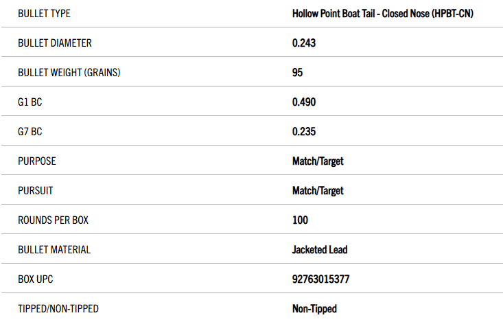 The 6mm 95 grain Hollow Point Boat Tail bullet was designed to fill the need for a lighter weight alternative to the Sierra 6mm 107 MatchKing. This bullet is a popular choice for across the course and long range target customers. Sierra built this bullet off our ever popular 6mm 107 HPBT MatchKing design with a long ogive, small meplat and improved boat tail to preserve downrange efficiency, enhance accuracy, and reduce wind-drift. While they are recognized around the world for record-setting accuracy, MatchKing® and Tipped MatchKing® bullets are not recommended for most hunting applications. Although MatchKing® and Tipped MatchKing® bullets are commonly used for varmint hunting, their design will not provide the same reliable explosive expansion at equivalent velocities in varmints compared to their lightly jacketed Hornet, Blitz or Varminter counterparts. This bullet requires a barrel twist rate of 1×9” or faster.