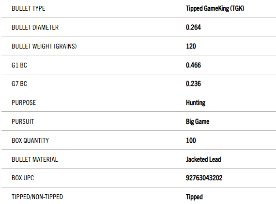 Those that are looking for an exciting varmint bullet in the 6.5 Creedmoor, 260 Remington, 6.5×55 Swede and larger cartridges, the 120 TGK will do an excellent job on coyotes and smaller vermin. Very flat shooting and dependable expansion make this very attractive. Provides a heavy varmint bullet that has greater wind deflection over lighter bullets, plus more penetration for larger varmints