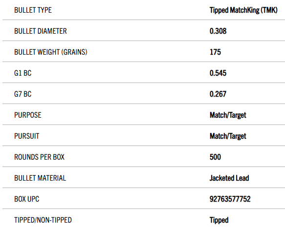Sierra has enhanced a segment of the MatchKing line by adding the acetal resin tip, thus crowning the Tipped MatchKing (TMK) bullet line. The major advantage of adding a tip to the bullet is the reduction of drag, producing a more favorable ballistic coefficient. The 175 grain 30 caliber MatchKing (#2275) was created to allow .308 Winchester shooters to stay supersonic at 1,000 yards. The popularity this advantage created made adding the 175 grain Tipped MatchKing (TMK) bullet a necessity. The 175 grain Tipped MatchKing (TMK) bullet is an excellent choice for F-Class (F Open) matches, as well as 3-Gun and various other competitions.