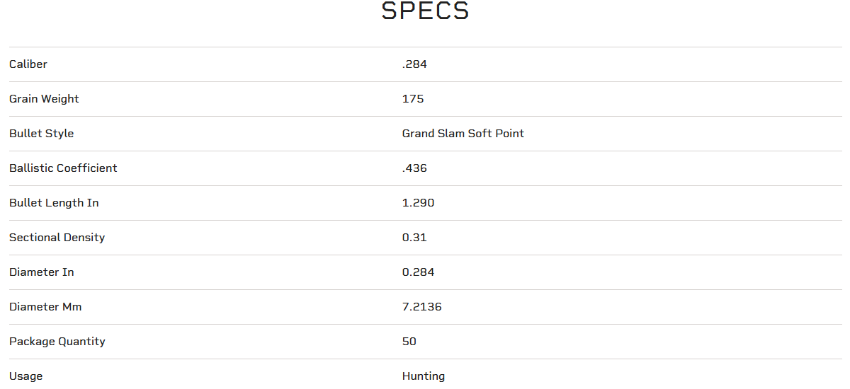 With a tapered, precision-drawn jacket and a long nose, the Grand Slam® bullet is engineered to blow through the thick hides, heavy bones and tough bodies of the biggest game animals—without sacrificing accuracy. On impact, internal jacket flutes allow consistent expansion, yet the bullet retains most of its weight for deep penetration every time.