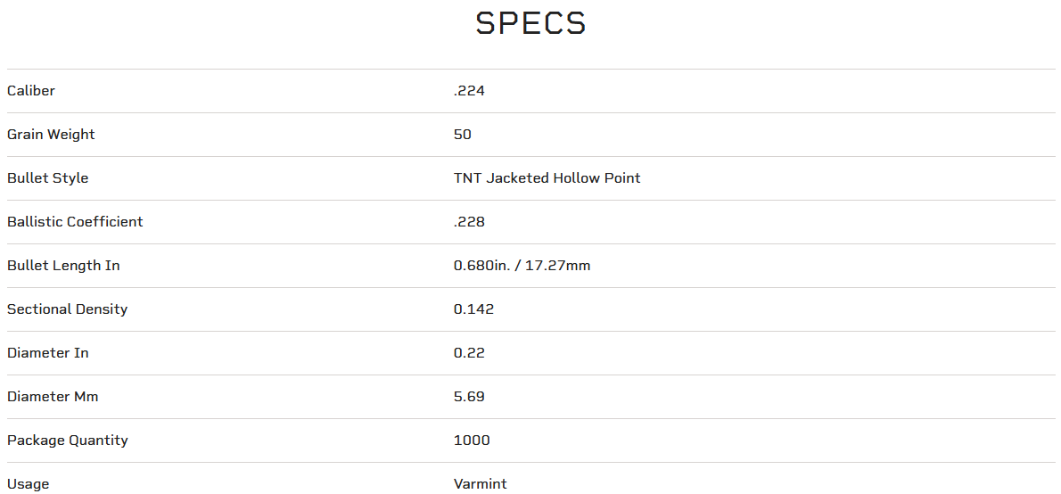 Speer® TNT gives predator and varmint hunters what they want most—pinpoint long-range accuracy and maximum destruction on impact. Its thin precision jacket features internal fluting to ensure complete bullet disruption, while its high ballistic coefficient produces the flattest trajectories possible. Excellent choice for coyote hunters trying to minimize pelt damage.