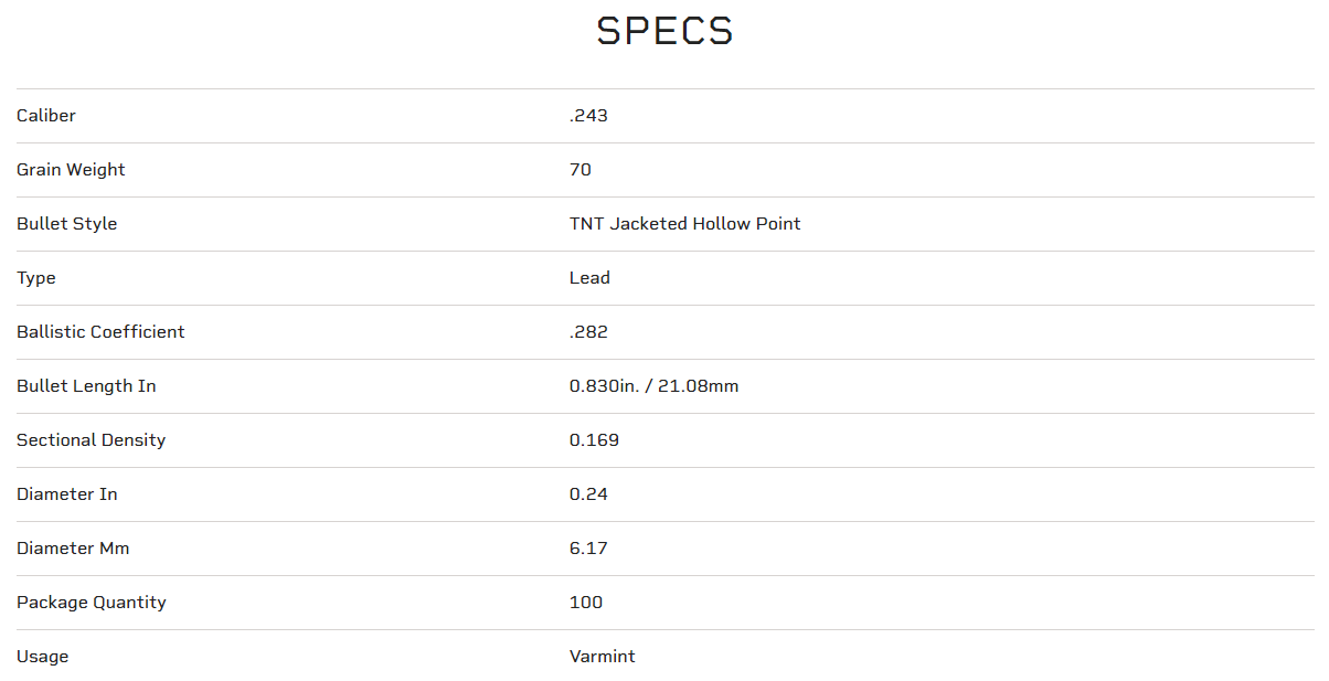 Speer® TNT gives predator and varmint hunters what they want most—pinpoint long-range accuracy and maximum destruction on impact. Its thin precision jacket features internal fluting to ensure complete bullet disruption, while its high ballistic coefficient produces the flattest trajectories possible. Excellent choice for coyote hunters trying to minimize pelt damage.